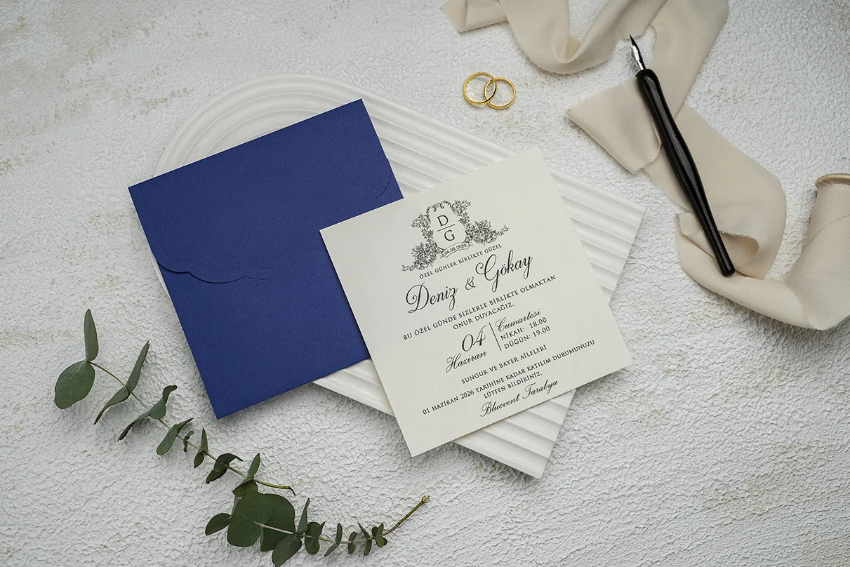 Invitație clasică de nuntă, minimalistă, ce se introduce într-un plic albastru. Plicul este inclus în prețul invitației dar se poate personaliza doar cu negru.