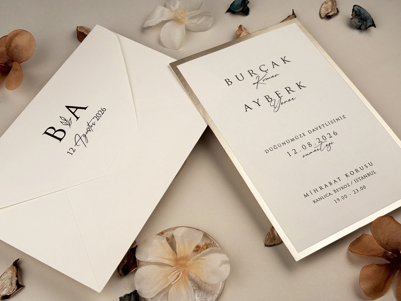 Invitație elegantă de nuntă cu design minimalist și cadran argintiu. Incitația este insoțită de un plic crem ce se pliază si care este decorat cu inițialele mirilor și data evenimentului, completate de un mic simbol floral. Plicul crem este inclus în preț. Culorile predominante care apar pe invitație sunt: argintiu, alb.