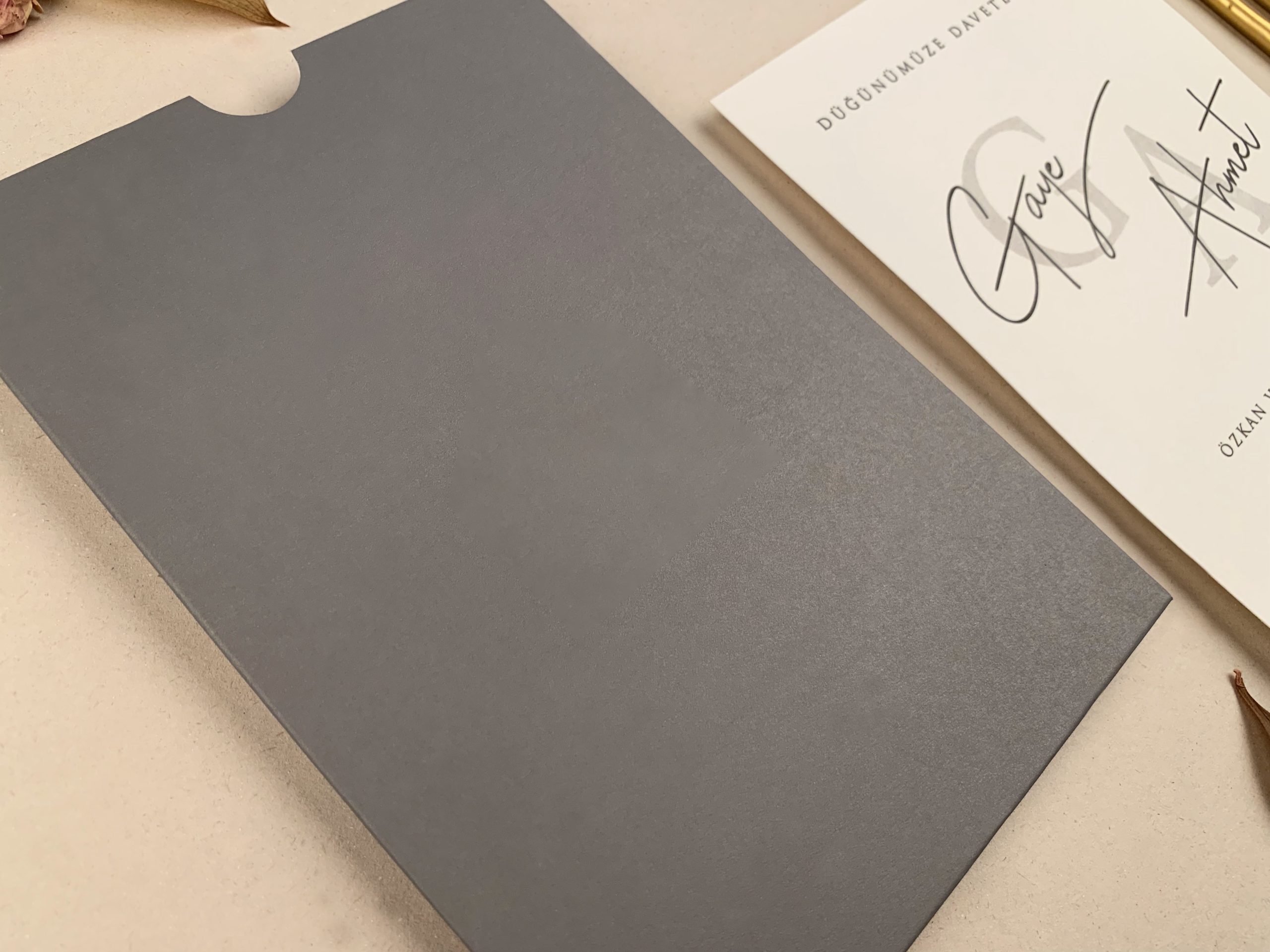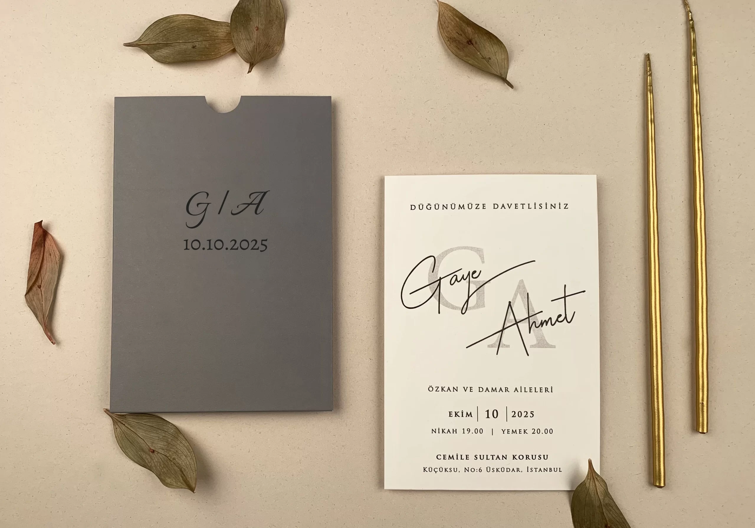 Invitație elegantă de nuntă cu design minimalist. Plicul gri este inclus în preț, dar se poate personaliza doar cu negru.