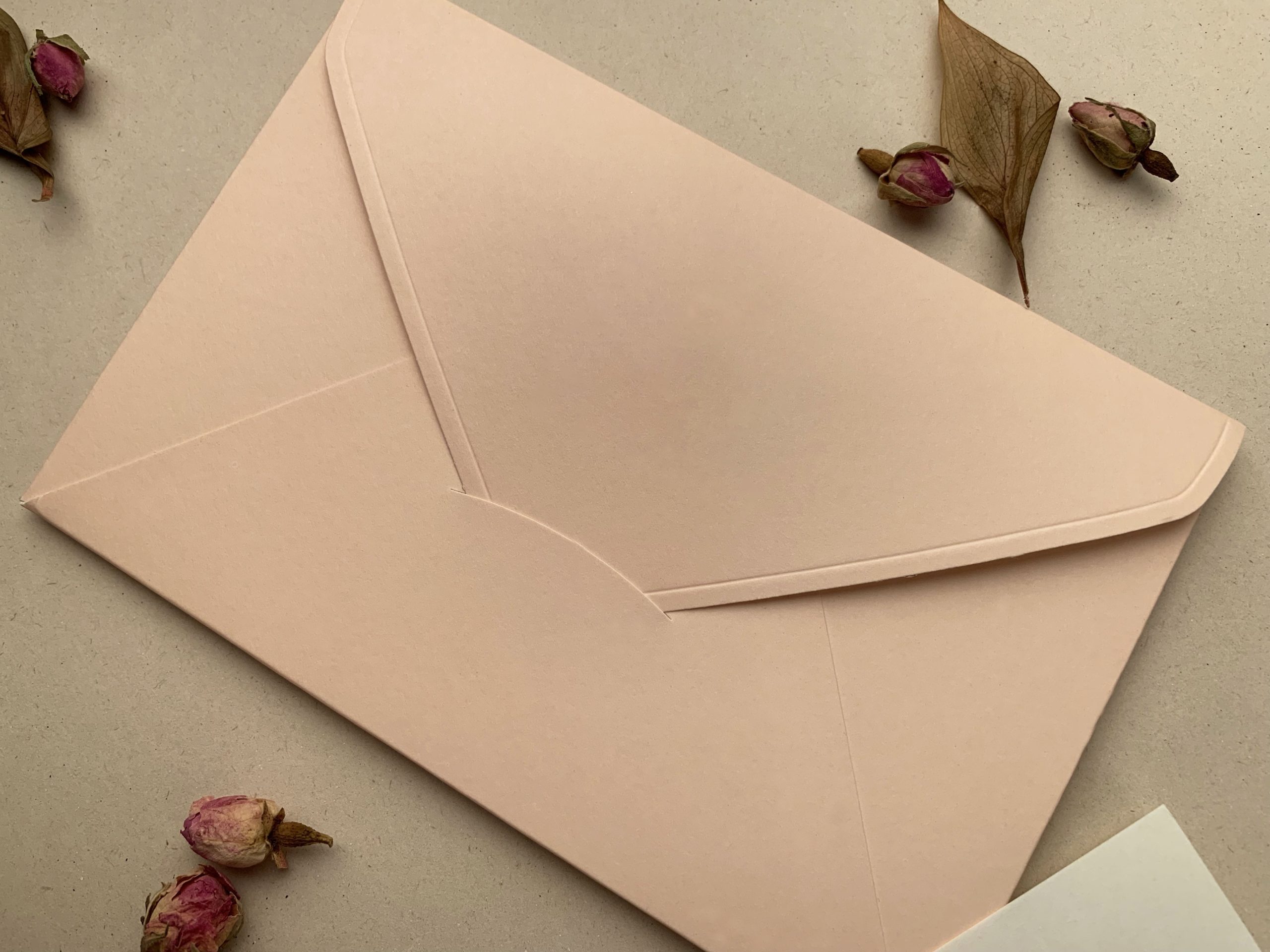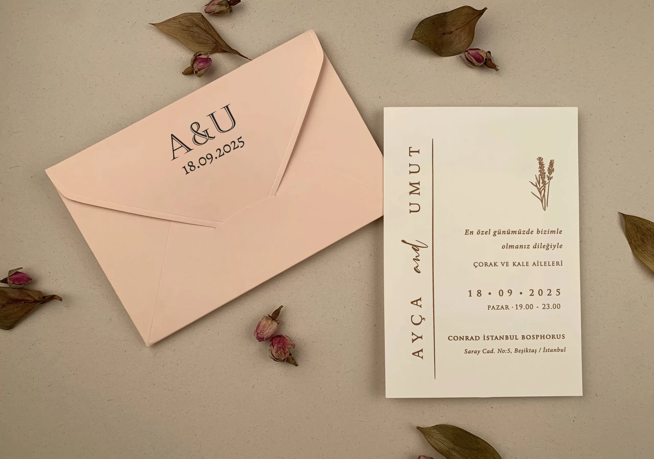 Invitație elegantă de nuntă cu design minimalist. Plicul roz este inclus în preț, dar se personalizează la cerere cu orice culoare în afară de argintiu și auriu.