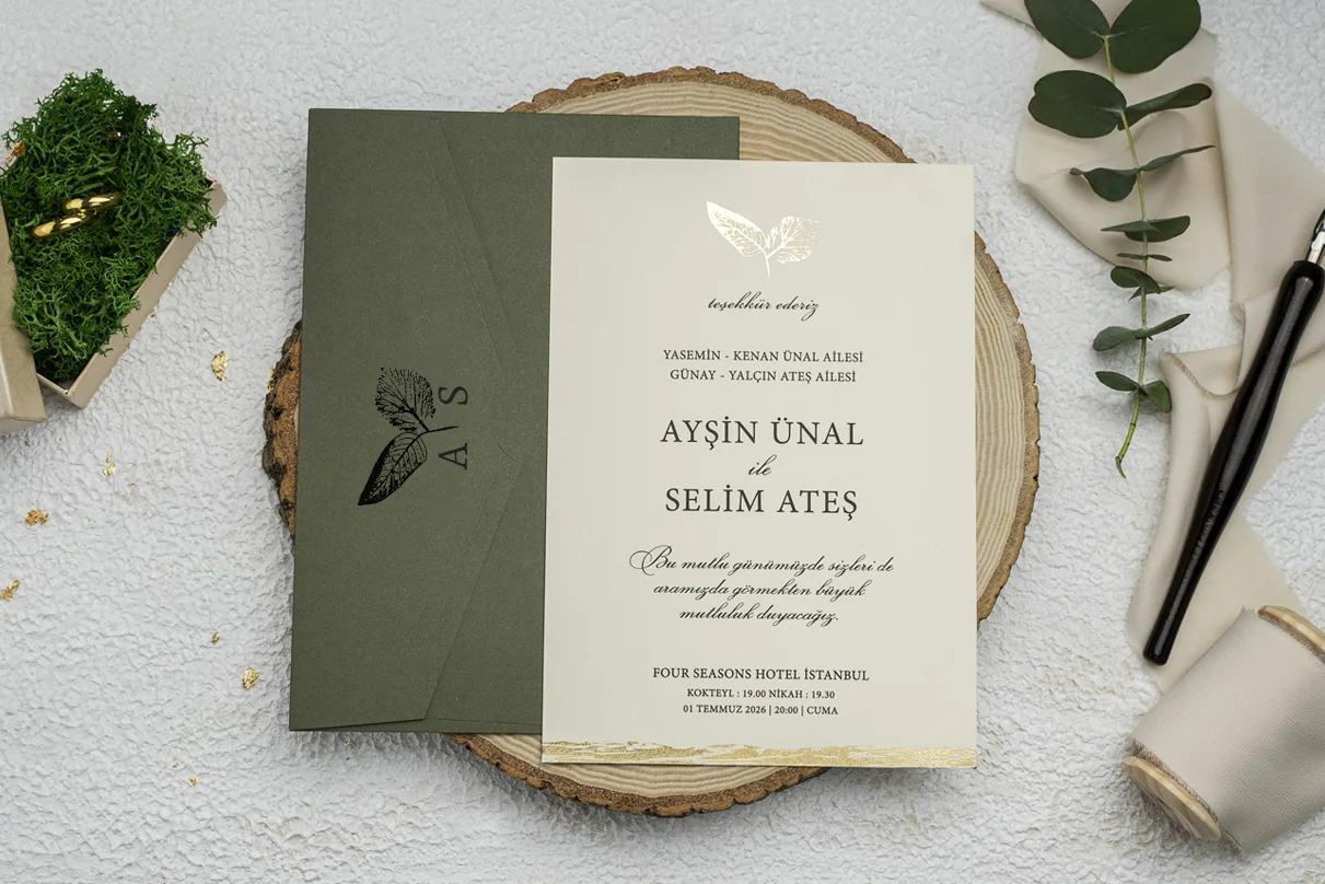 Invitație elegantă de nuntă, minimalistă, cu plic de culoare vernil. Plicul este inclus în prețul invitației, dar se personalizează la cerere doar cu negru.