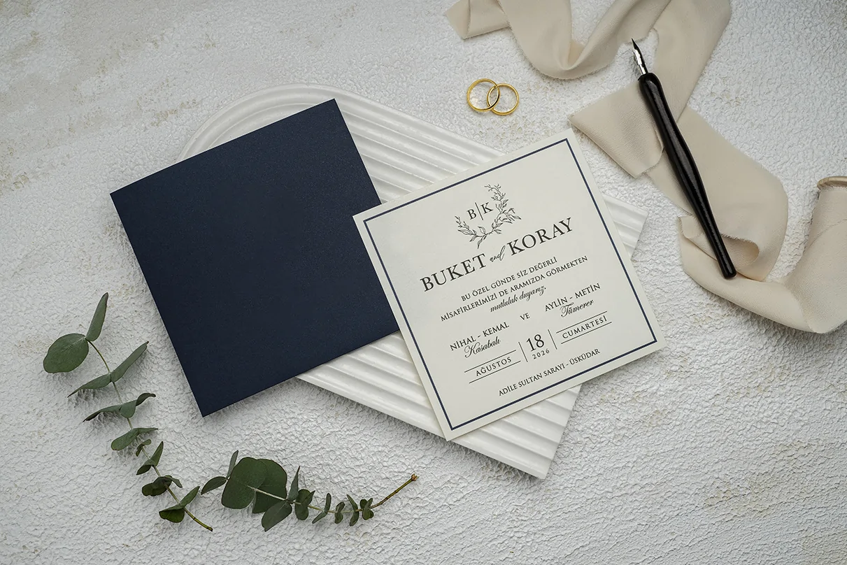 Invitație elegantă de nuntă, minimalistă, cu delimitare neagră. Plicul bleomarin cu simbol auriu este inclus în prețul invitației dar nu se poate personaliza.