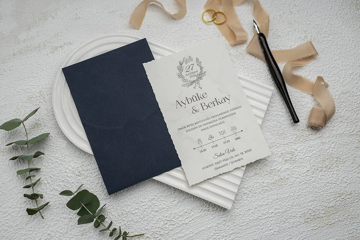 Invitație elegantă de nuntă, marmorata. Plicul bleumarin este inclus în prețul invitației, dar nu se poate personaliza.