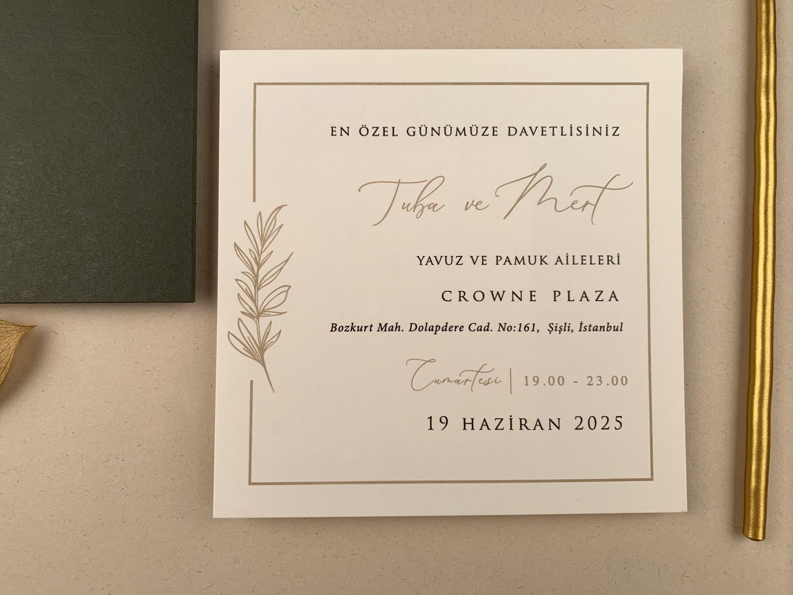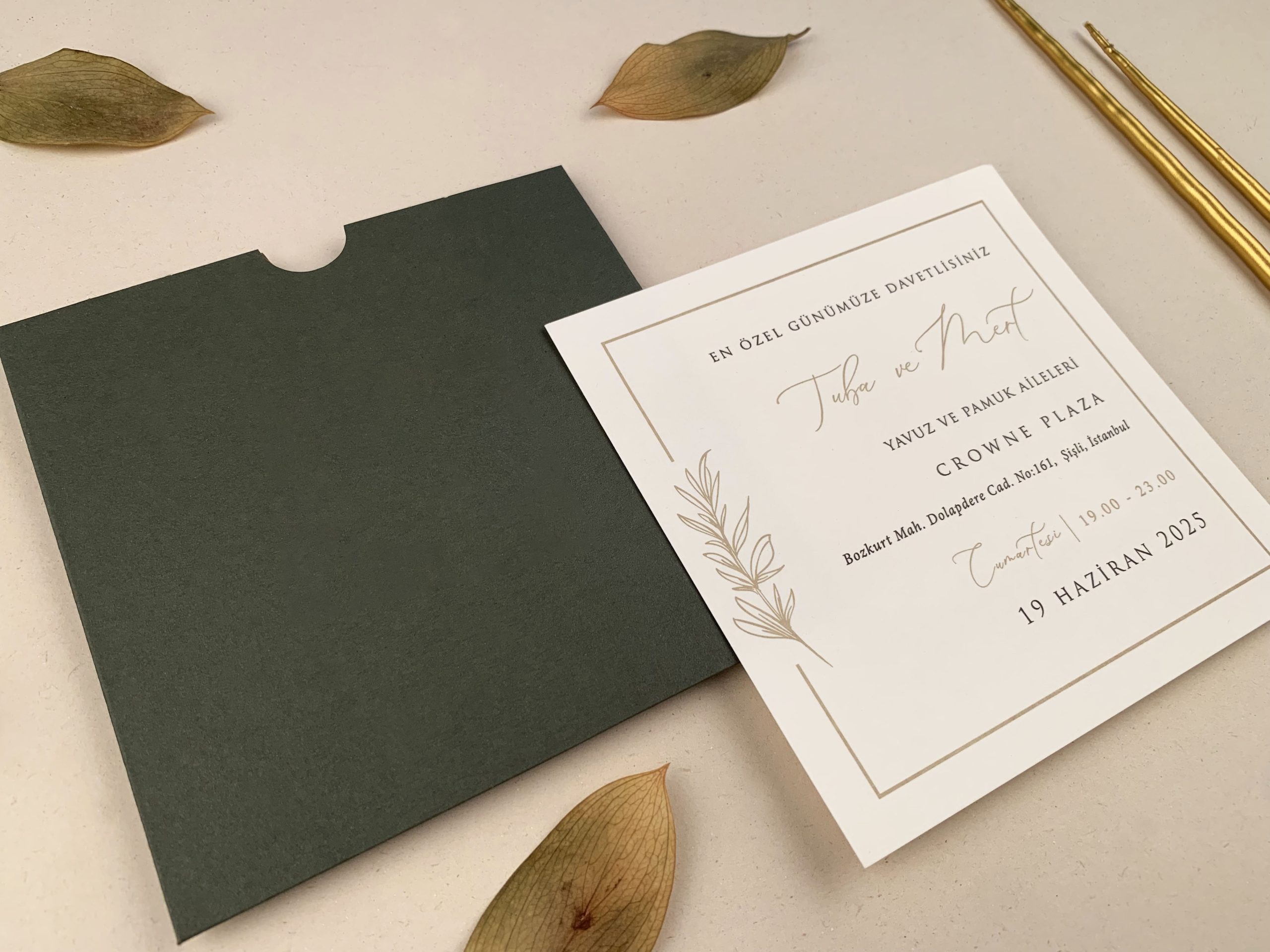 Invitație rustică de nuntă cu design minimalist. Plicul pătrat verde închis, tip buzunar, este inclus în preț, dar se poate personaliza doar cu negru.