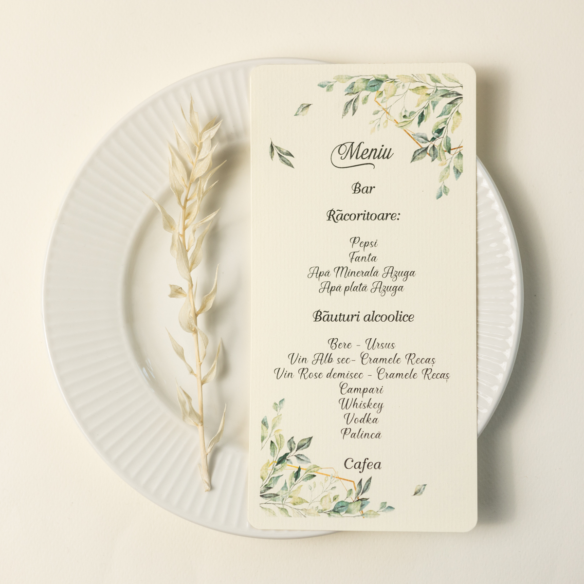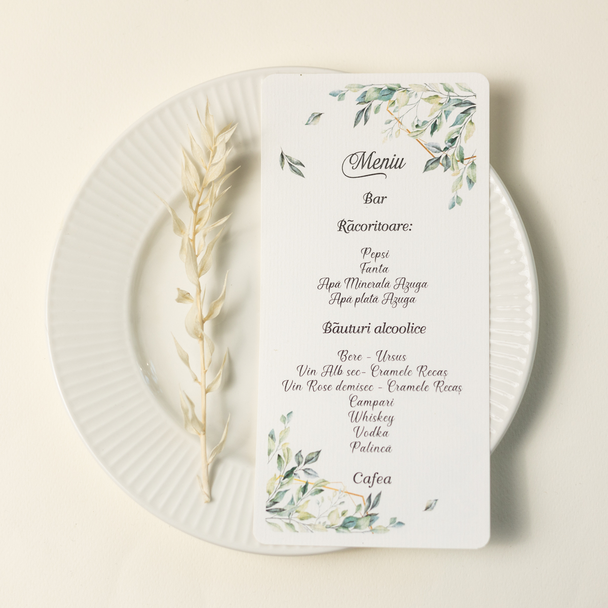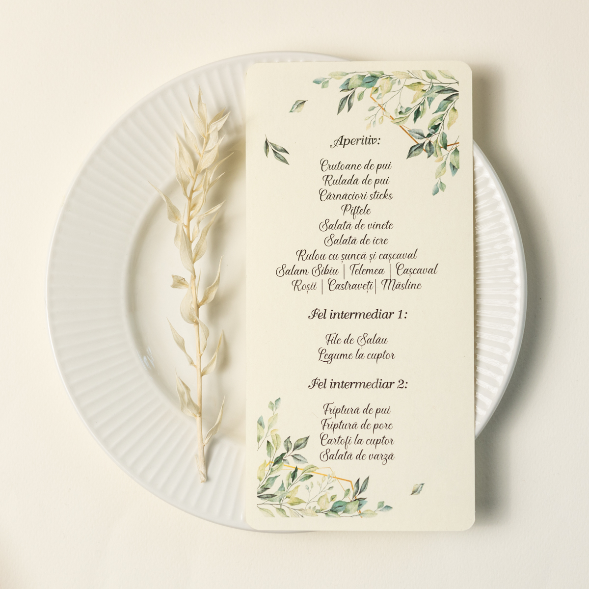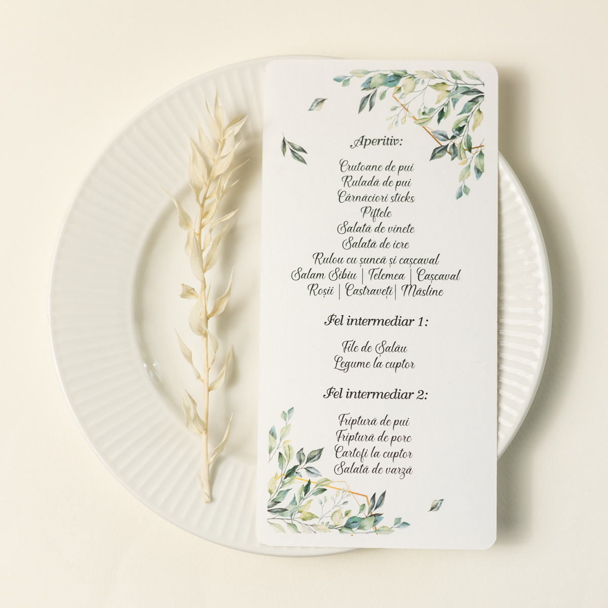 Meniu pentru farfurie cu model din frunze.