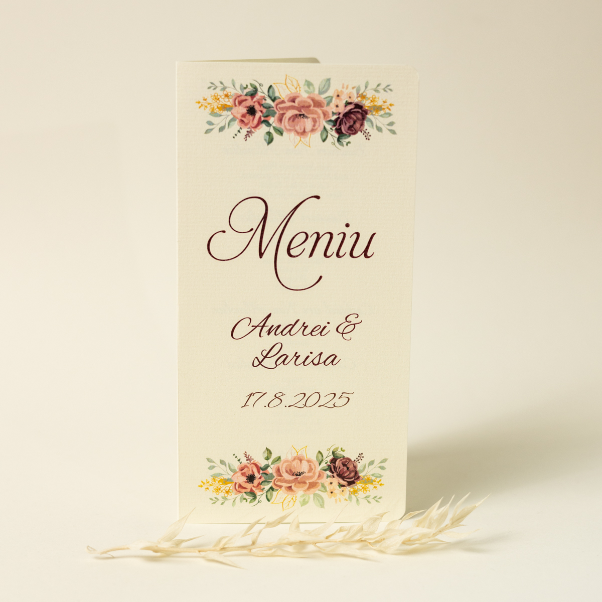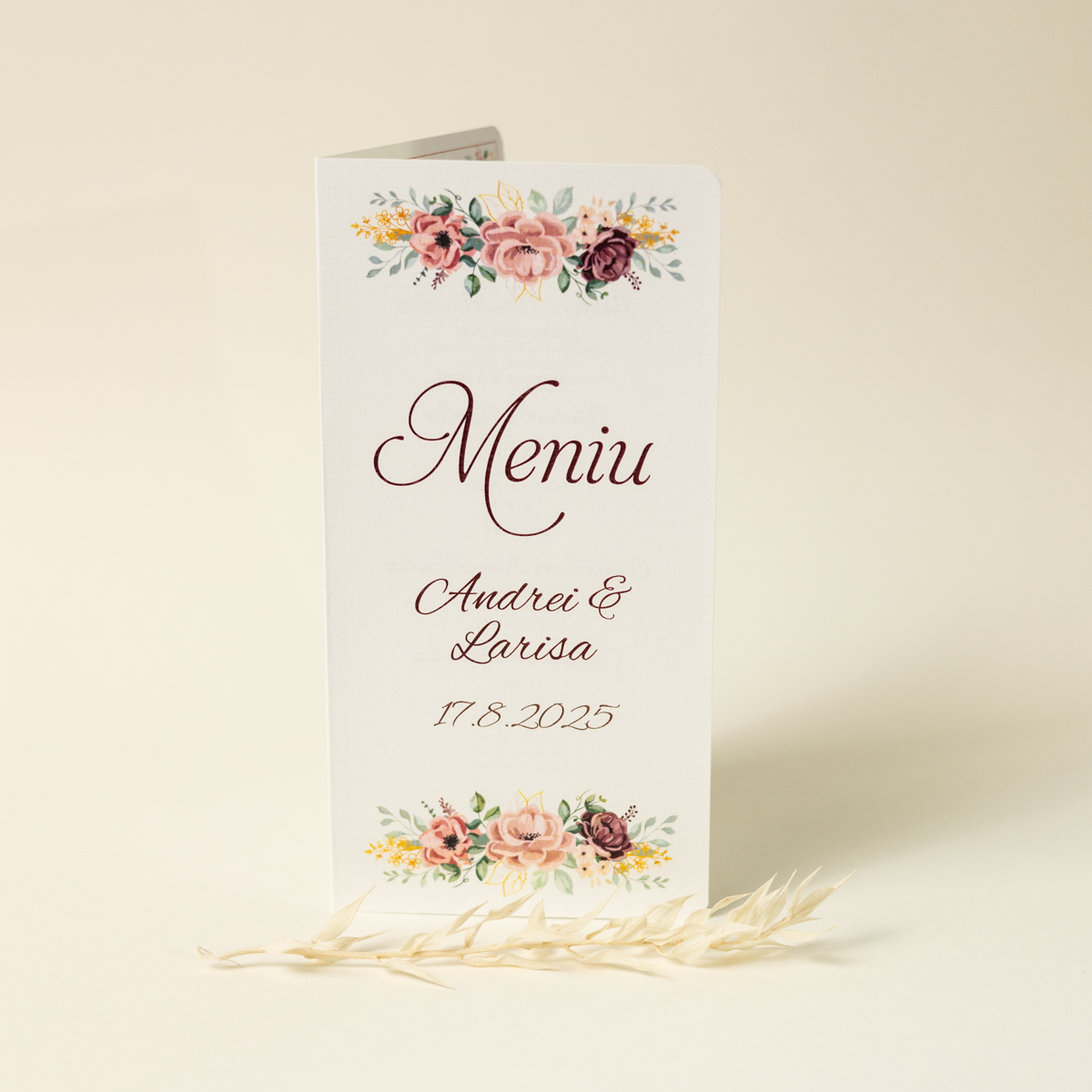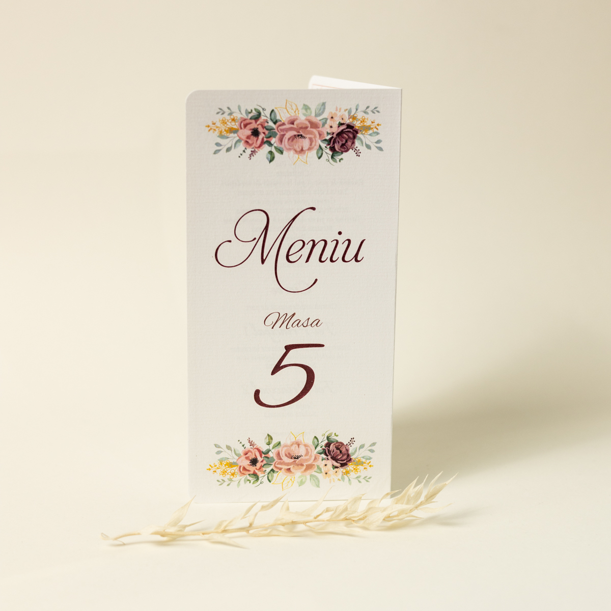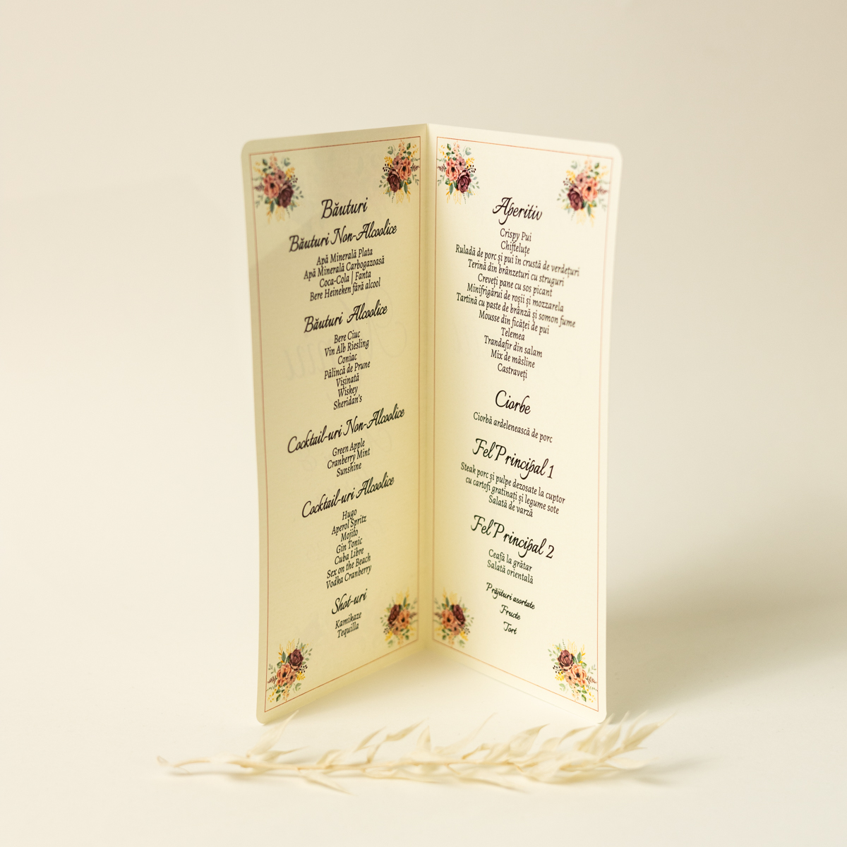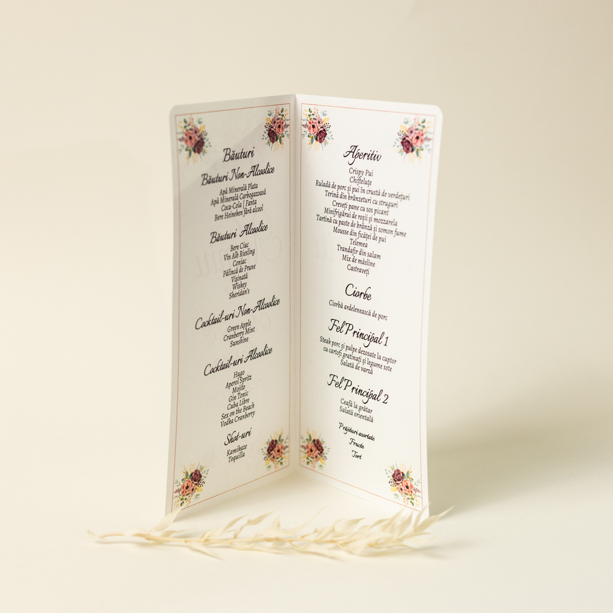 Meniu tip carte cu model floral.