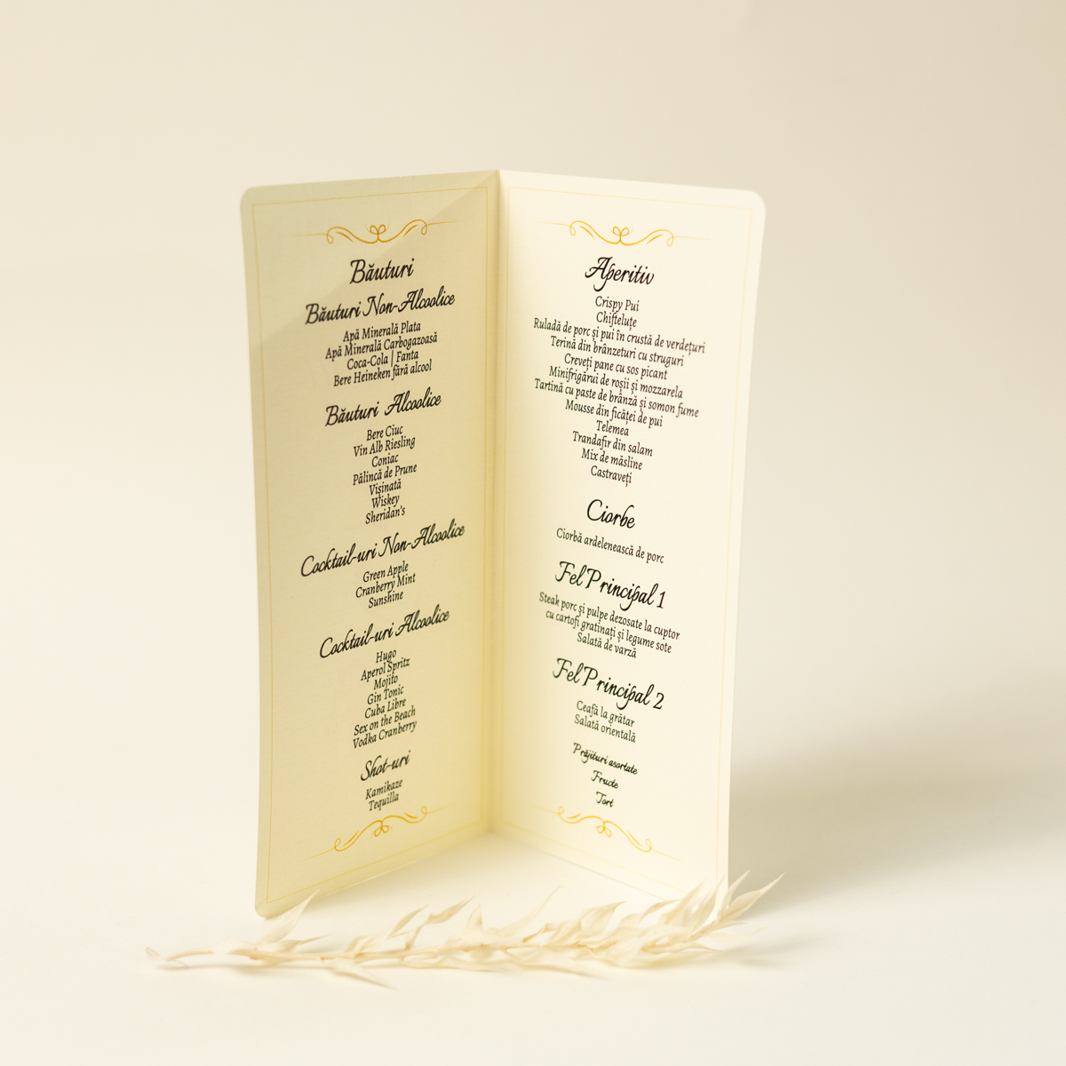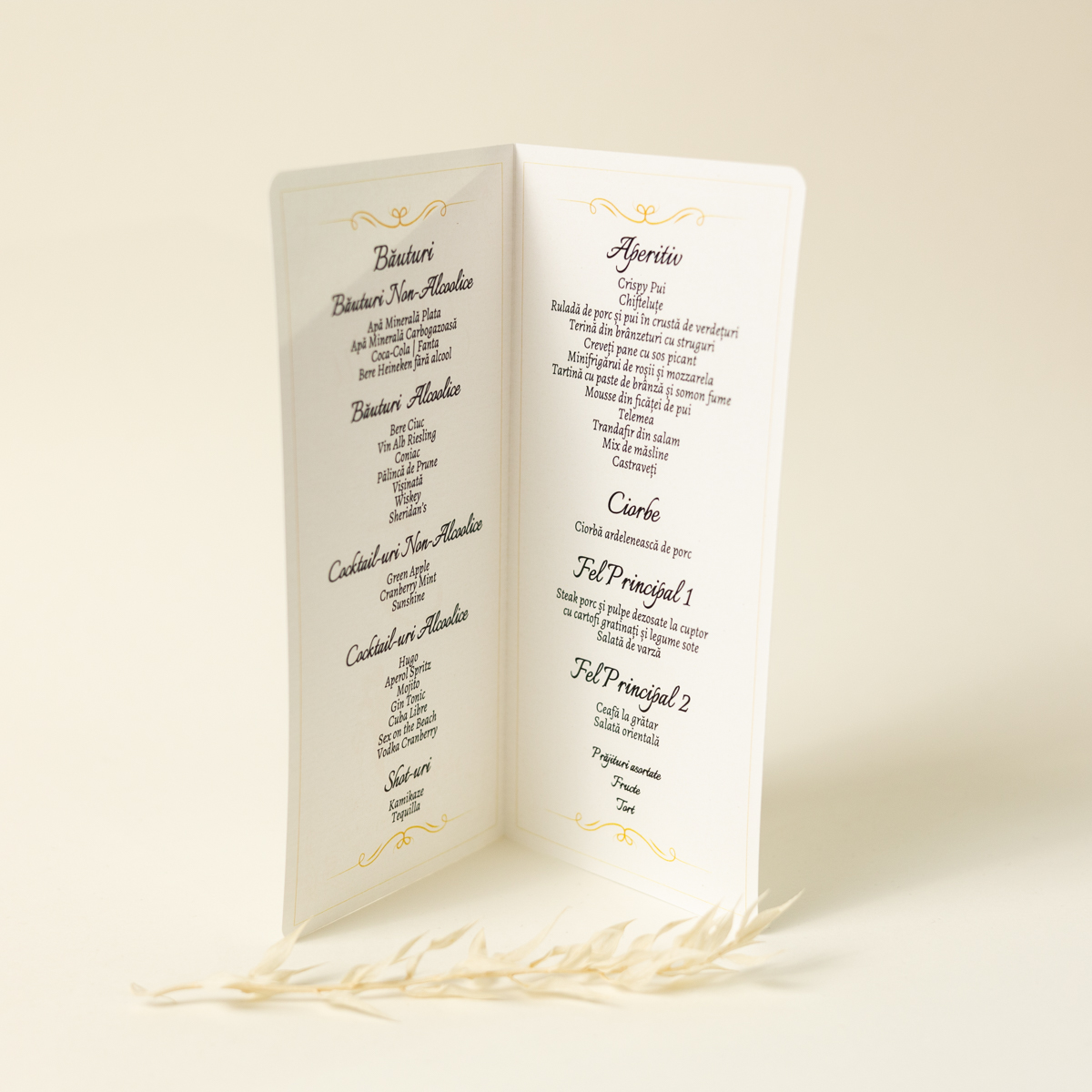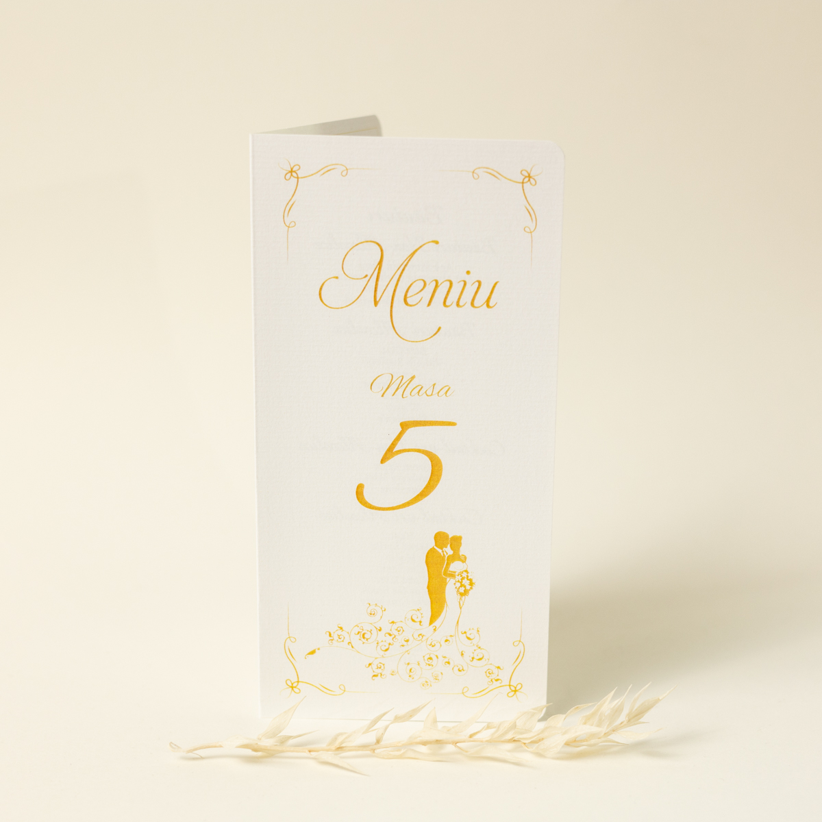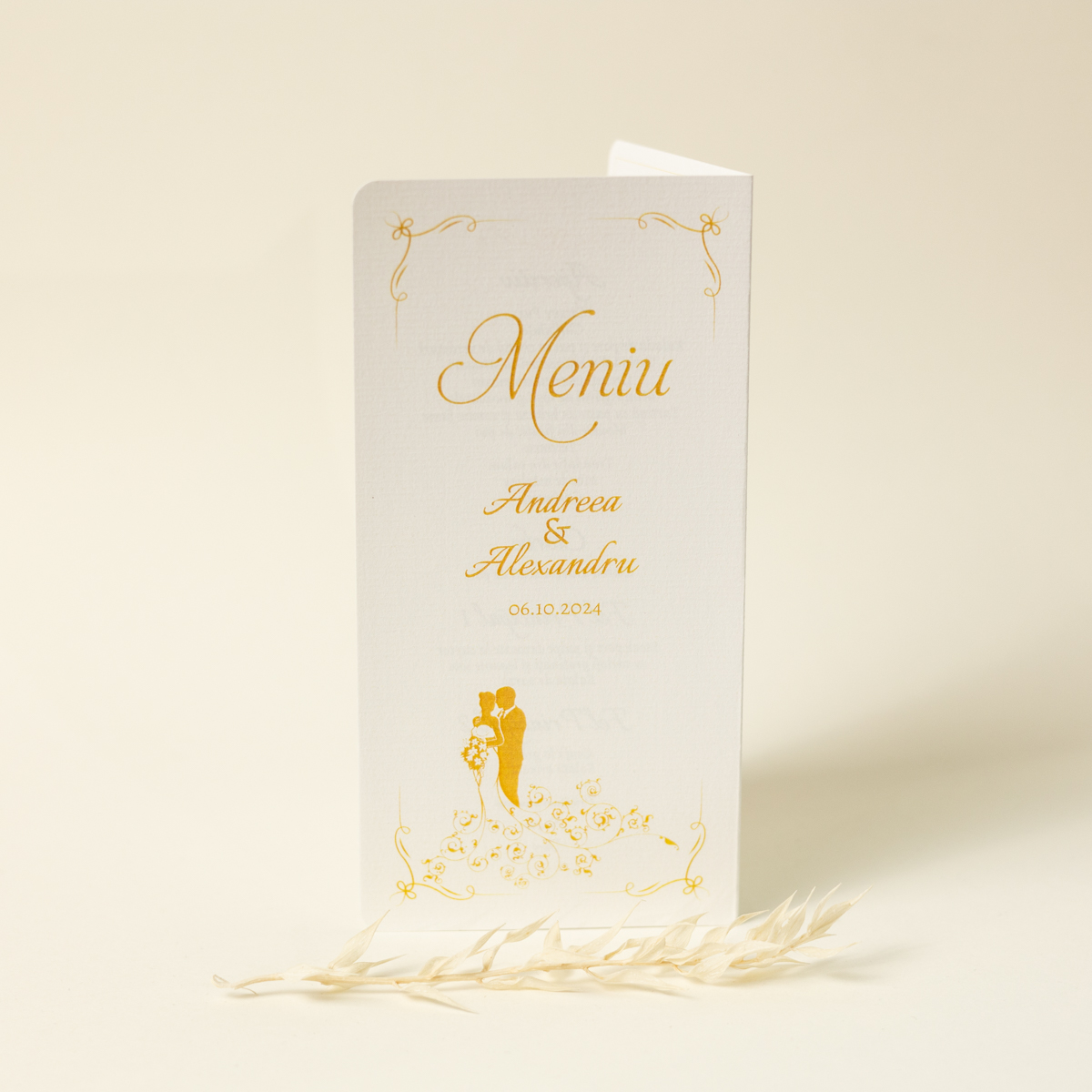 Meniu tip carte decorat cu siluetă miri. Se pliază în două iar textul este în interior.
