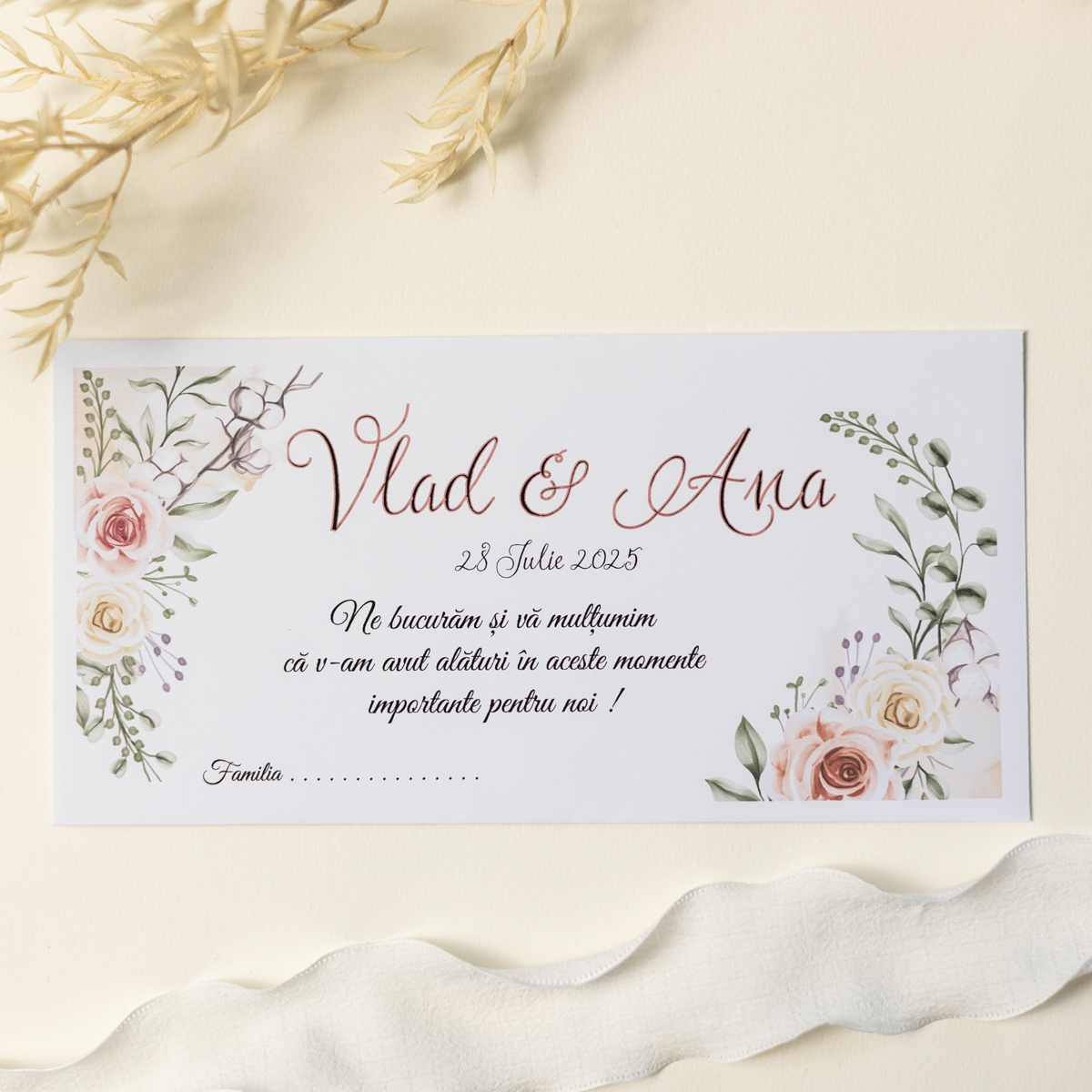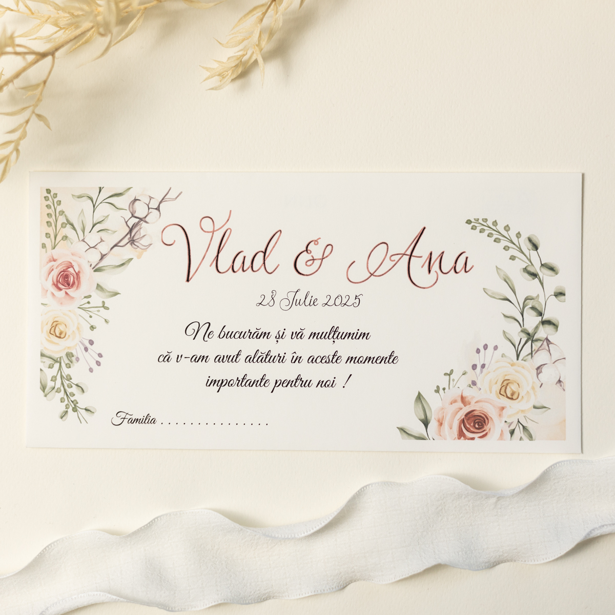 Plicul este imprimat pe carton texturat alb sau crem, la alegere. Imprimarea se realizează doar pe o parte a plicului. Prețul include personalizarea textului, iar plicul va fi livrat cu bandă dublu adezivă pentru închidere.