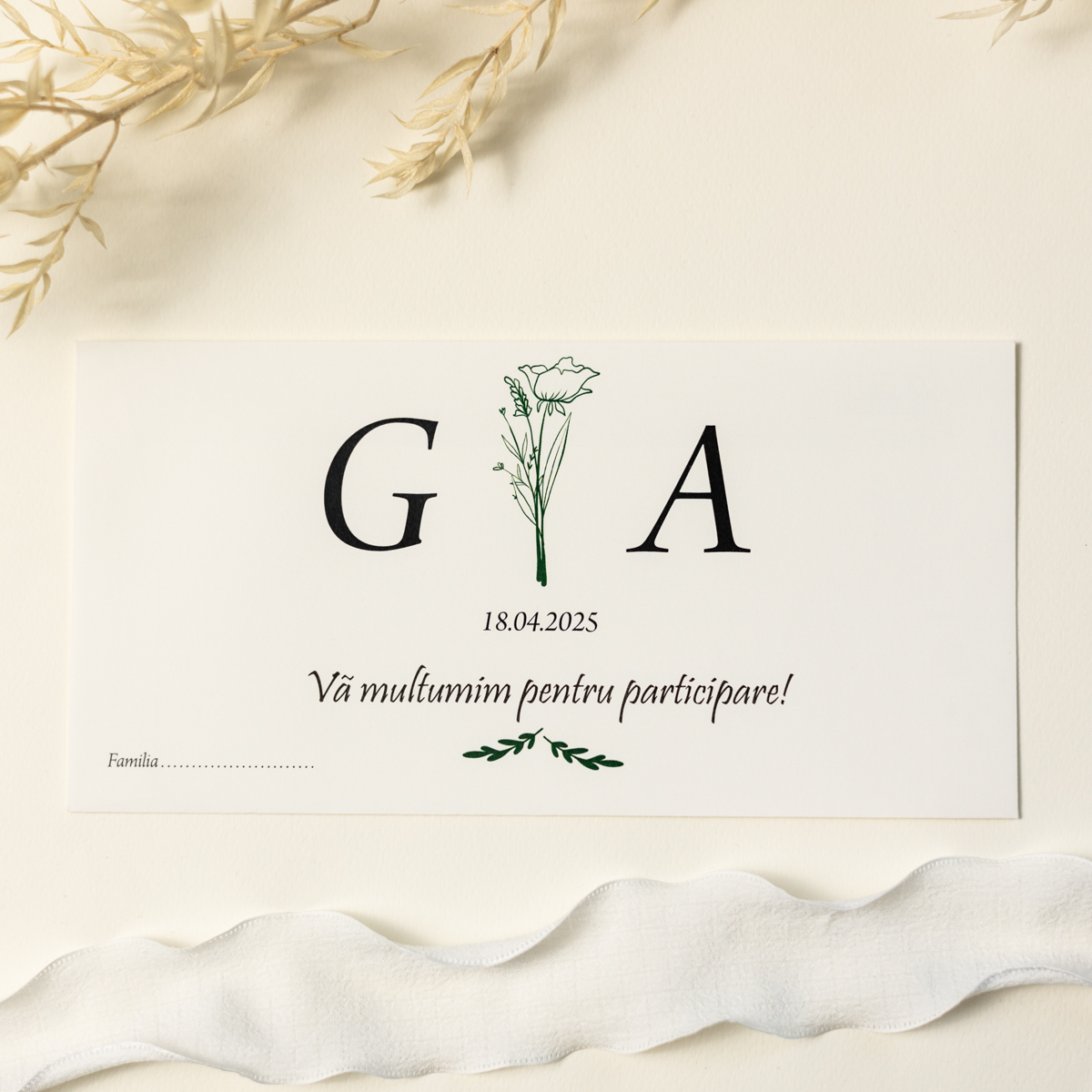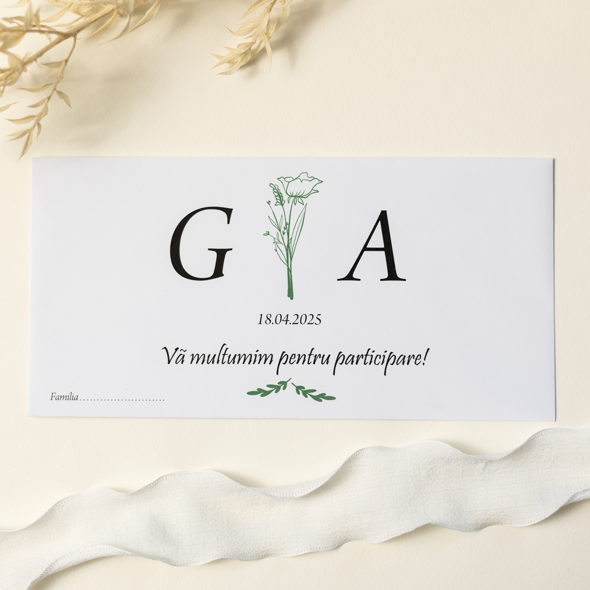 Plicul este imprimat pe carton texturat alb sau crem, la alegere. Imprimarea se realizează doar pe o parte a plicului. Prețul include personalizarea textului, iar plicul va fi livrat cu bandă dublu adezivă pentru închidere.