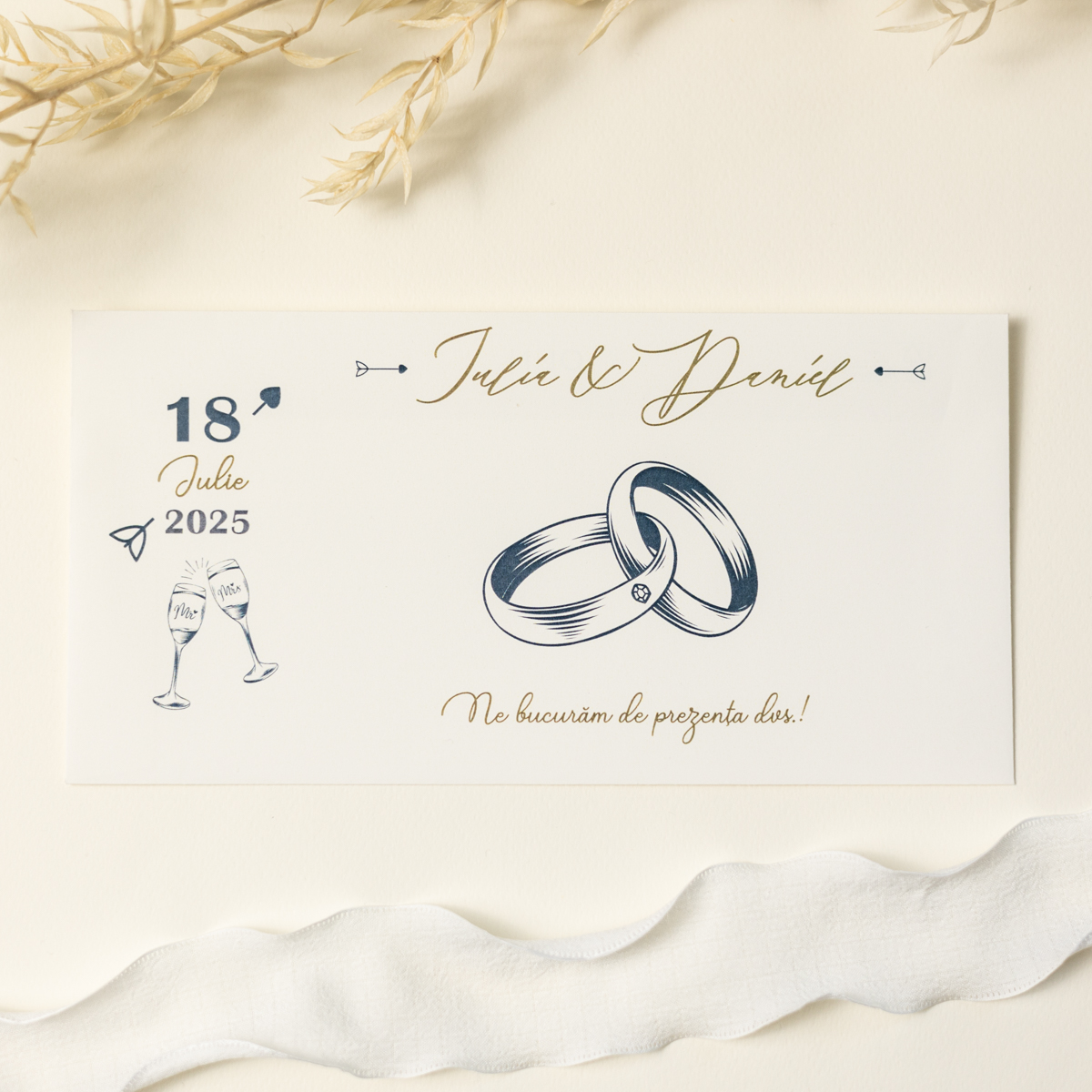 Plicul este imprimat pe carton texturat alb sau crem, la alegere. Imprimarea se realizează doar pe o parte a plicului. Prețul include personalizarea textului, iar plicul va fi livrat cu bandă dublu adezivă pentru închidere.