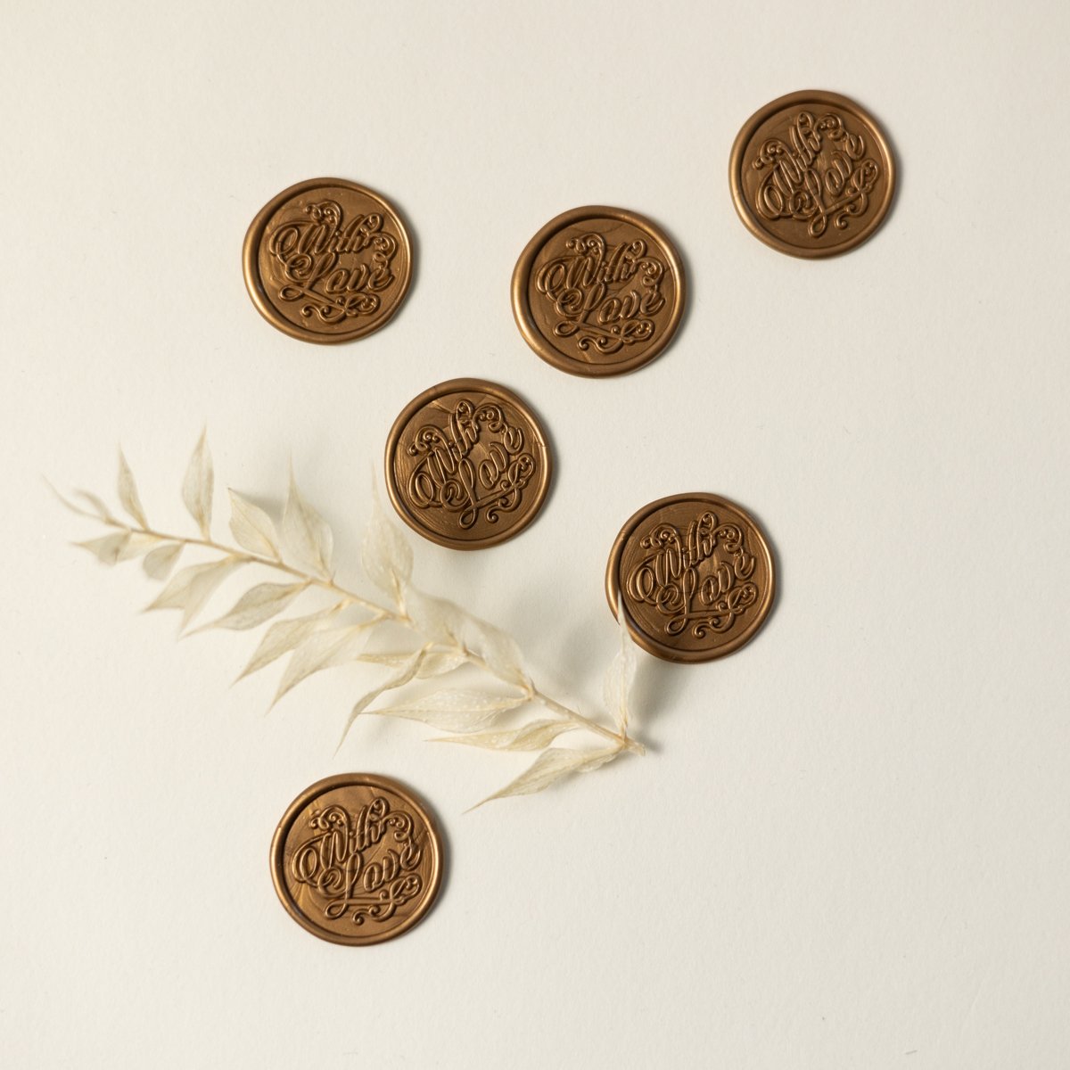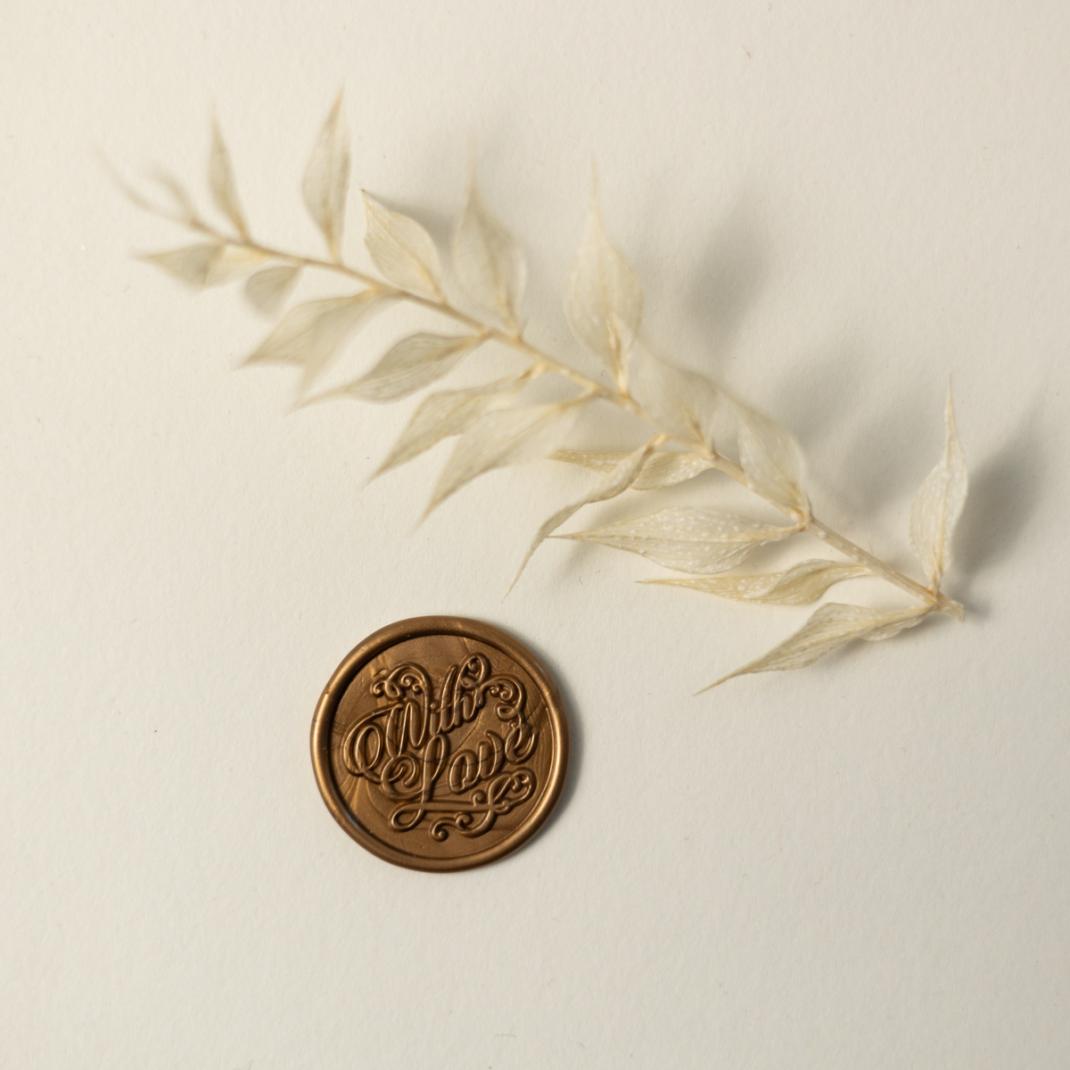 Sigiliu de ceară pentru invitații de nuntă, rotund, model text ”With love”.