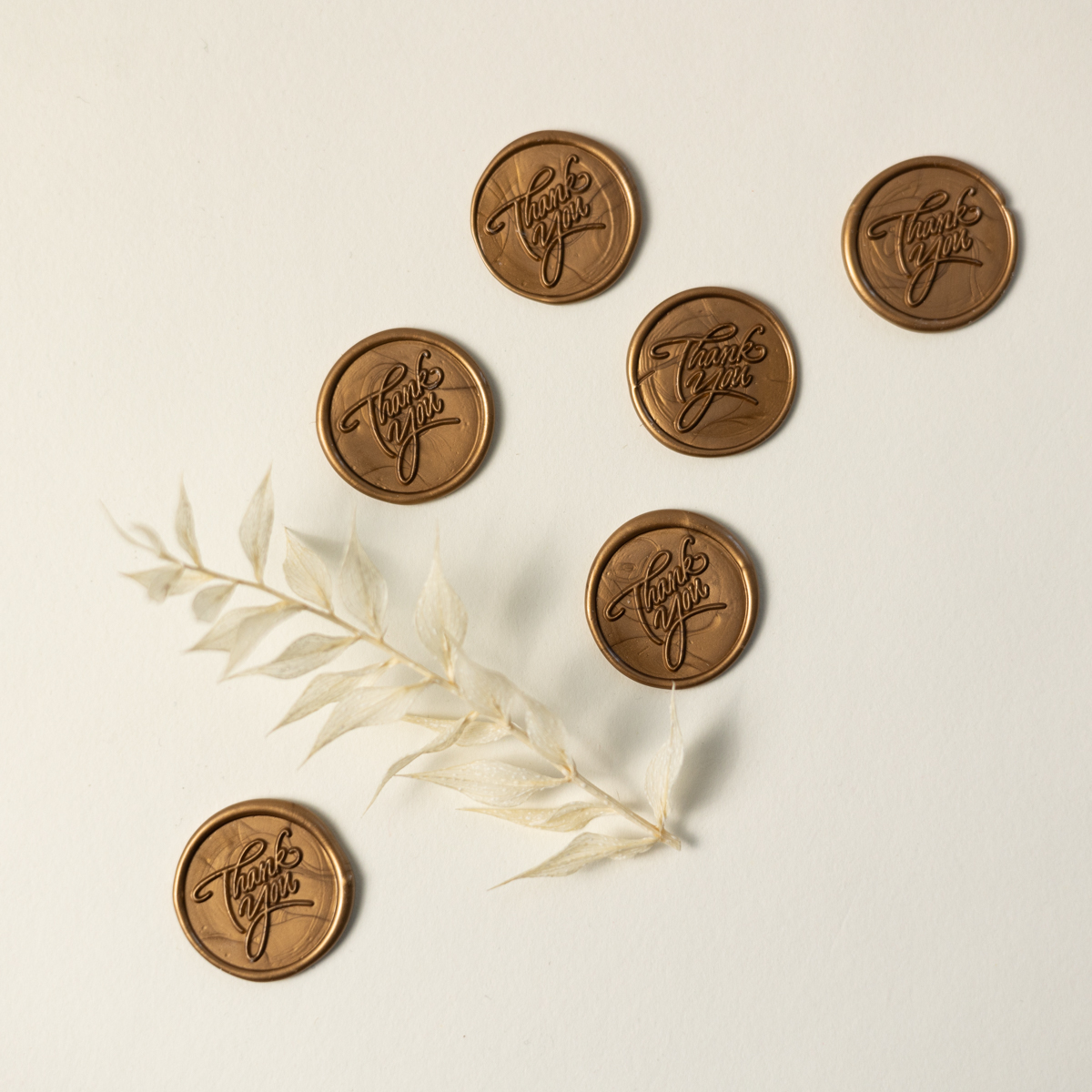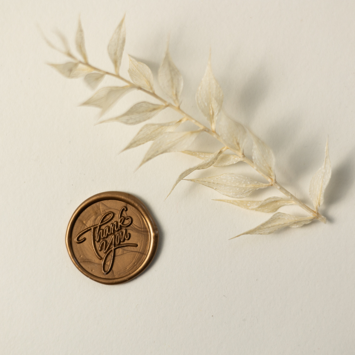 Sigiliu de ceară pentru invitații de nuntă, rotund, model text ”Thank you”.